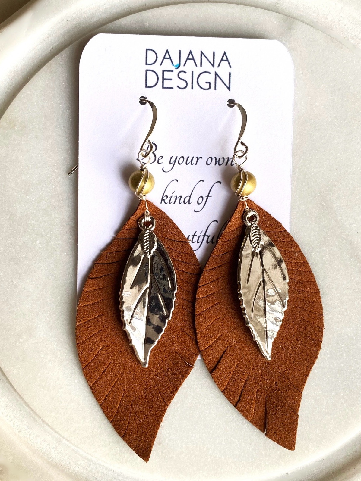 These cool leaf earrings are designed with coated brass beads and hypoallergenic silver-plated earring hooks. The brown leaves are made with vegan material. Overall length is 3.25 inches.