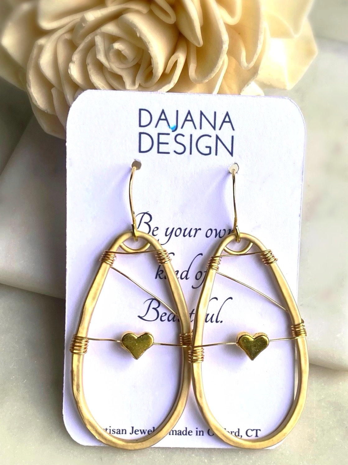 Lovely and sleek heart earrings designed from the heart. The earring hooks are gold-plated and hypoallergenic. It’s a lightweight and feminine design that measures 2.5 inches in length.
