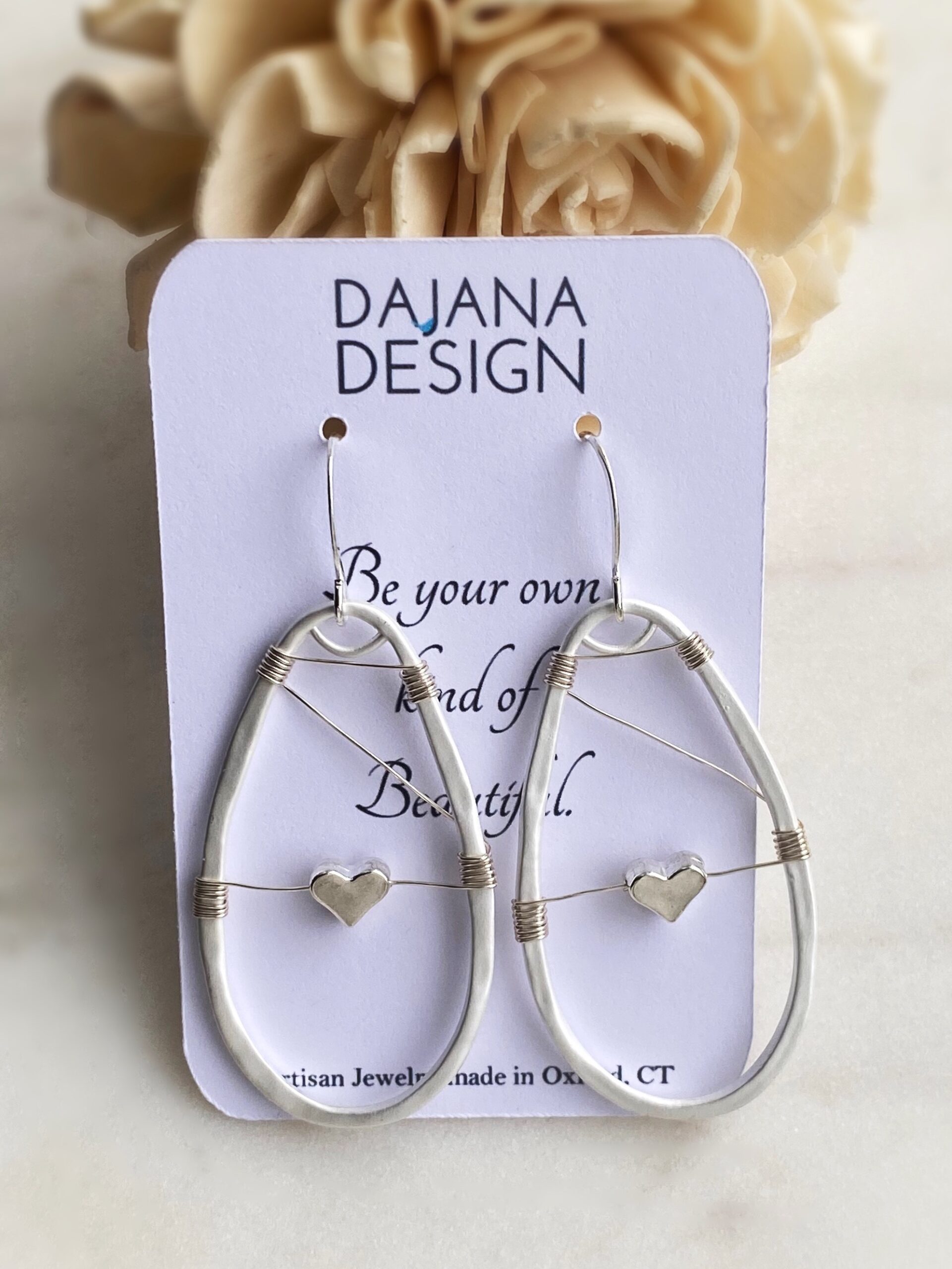 Simple and sleek heart earrings designed from the heart. The earring hooks are silver-plated and hypoallergenic. It’s a lightweight and feminine design that measures 2.75 inches in length.